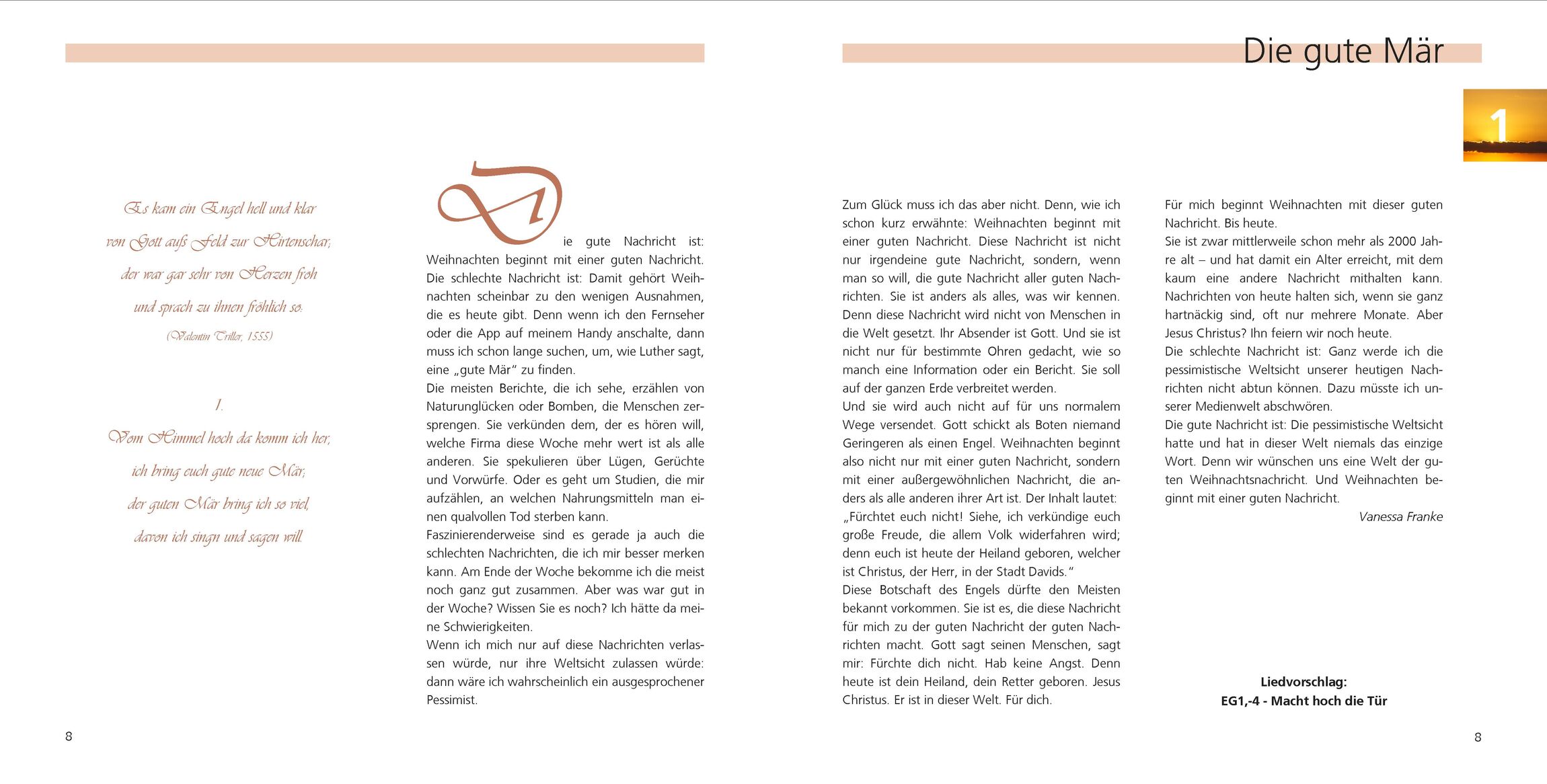 Dazu die Geschichte des Liedes und ein Vorschlag für eine Liturgie. Damit ist es möglich, eine komplette Reihe von Adventsandachten zu gestalten.