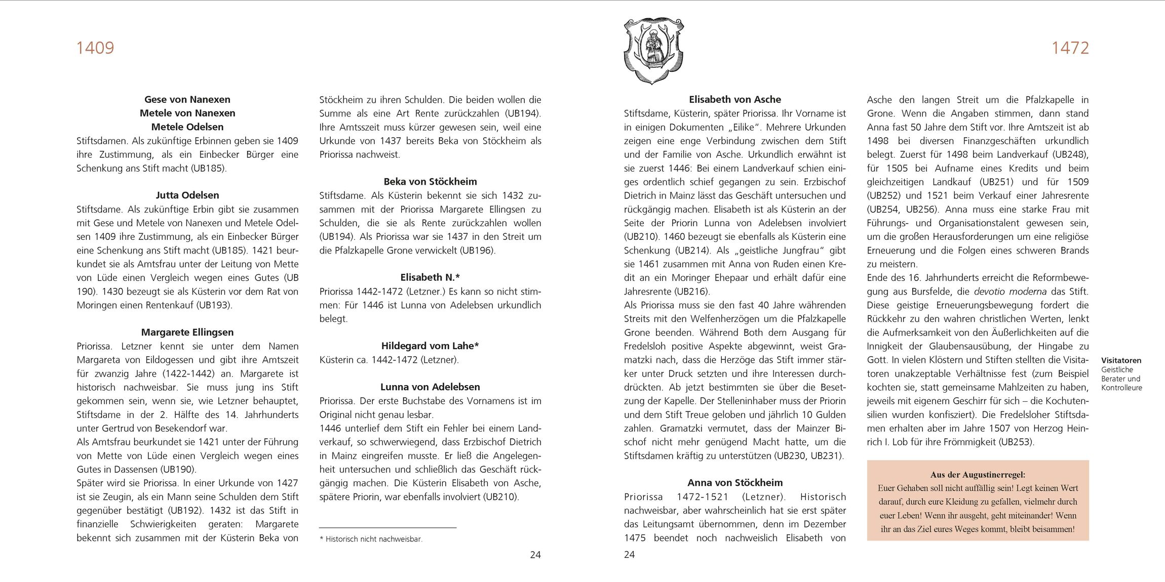 Mit diesem Heft wird wir an diese Frauen erinnert. Nach so vielen Jahrhunderten des Vergessens werden ihre Namen genannt, gezeigt, was die Urkunden über sie verraten und ihr Leben in der Geschichte des Stiftes eingeordnet. Die jeweiligen Ereignisse gehörten zu ihrem Alltag, bestimmten ihr Schicksal, ihre Gedanken und Gespräche.