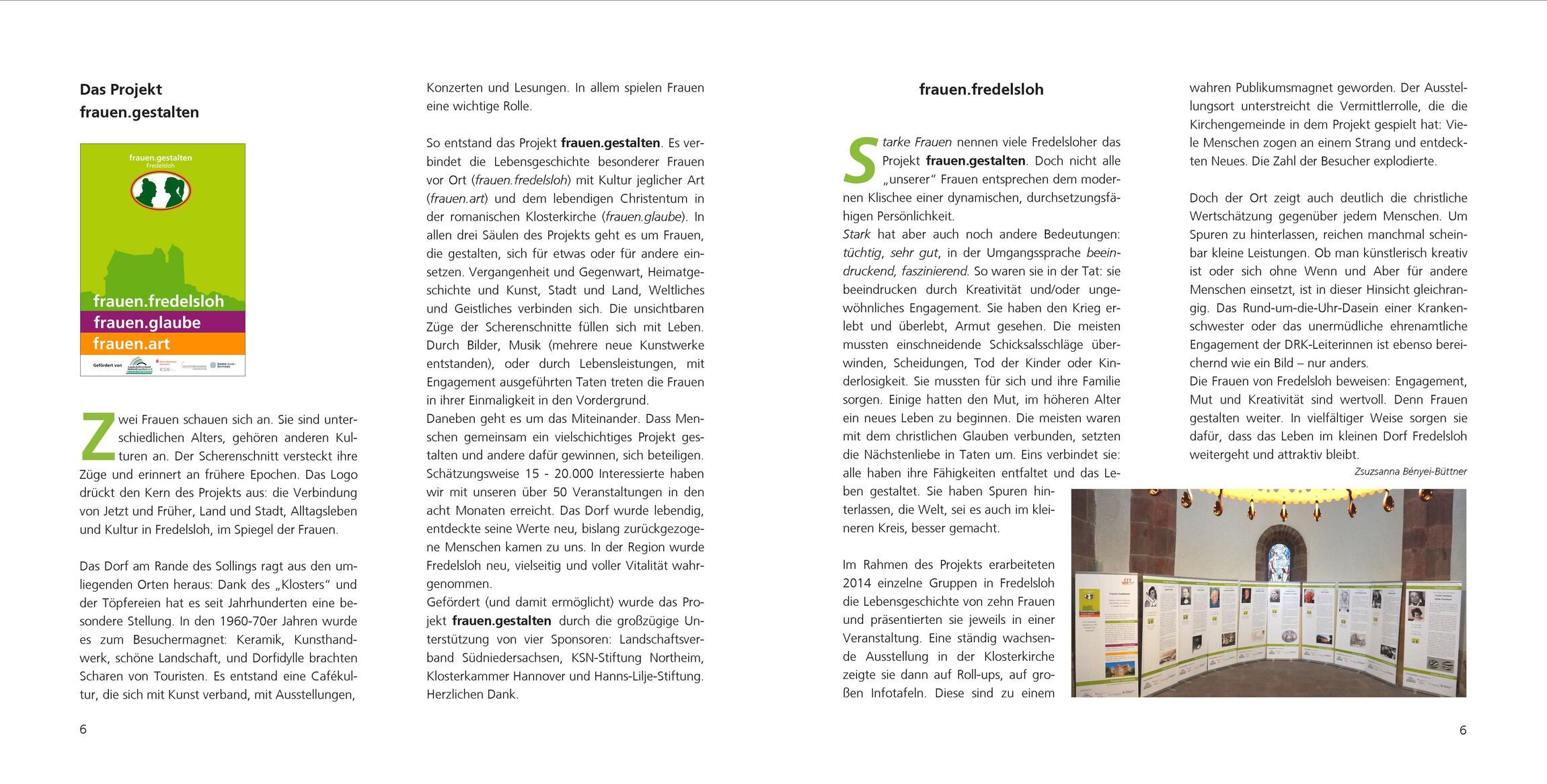 Im Rahmen des Projekts frauen.fredelsloh erarbeiteten 2014 einzelne Gruppen in Fredelsloh die Lebensgeschichte von zehn Frauen und präsentierten sie jeweils in einer Veranstaltung. Eine ständig wachsende Ausstellung in der Klosterkirche zeigte sie dann auf großen Infotafeln. Die Frauen von Fredelsloh beweisen: Engagement, Mut und Kreativität sind wertvoll.
