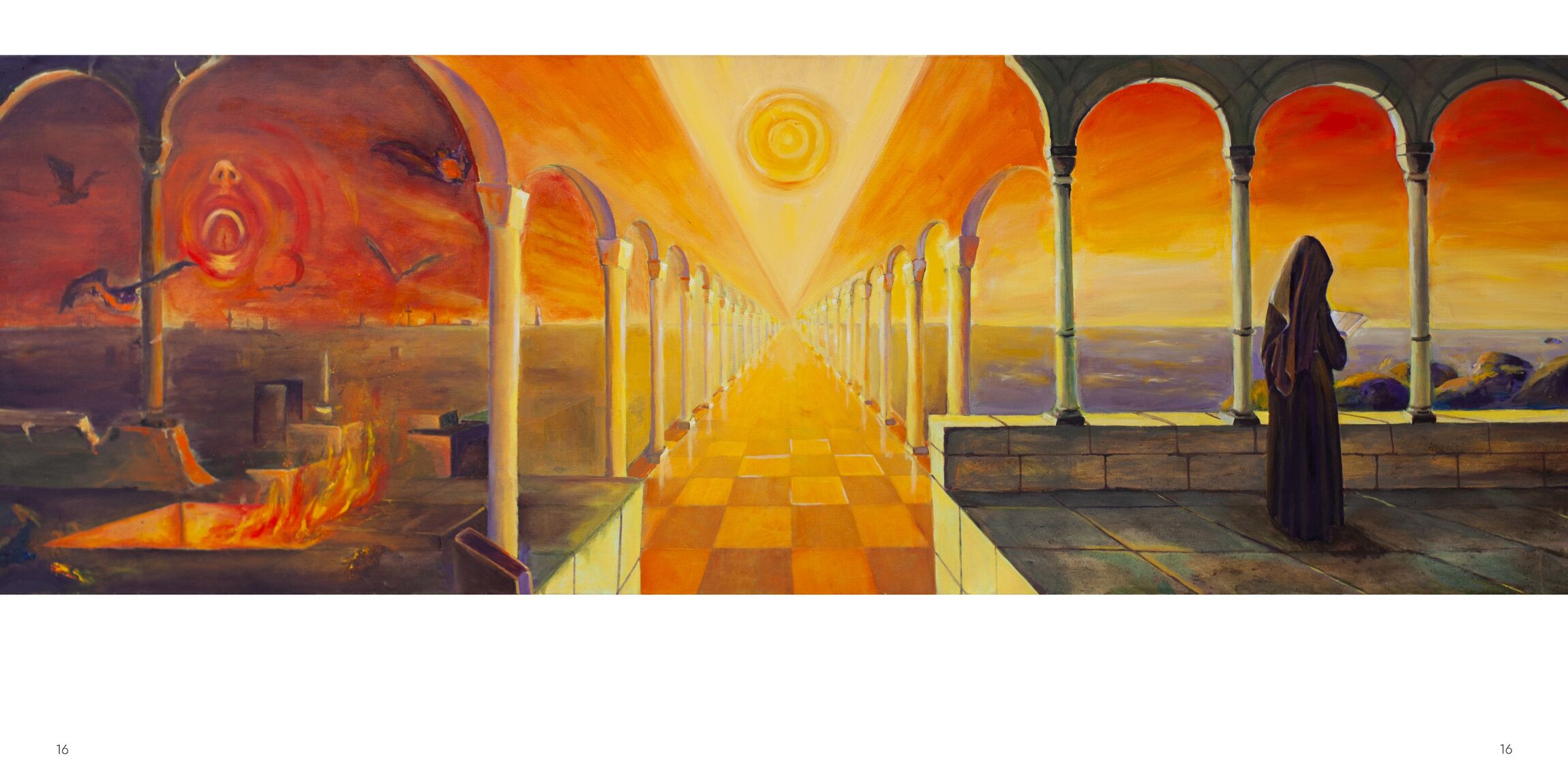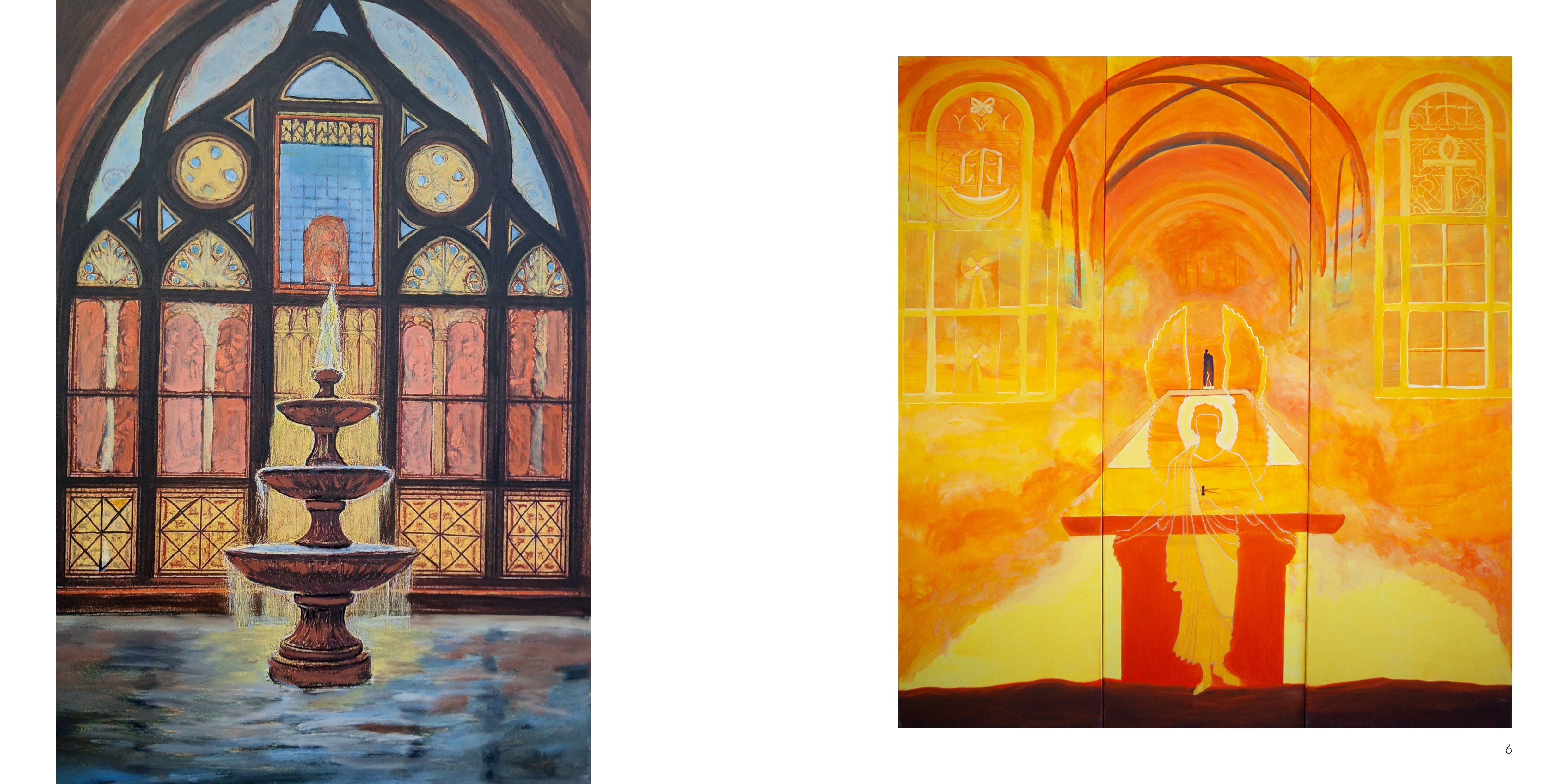 Die Werke von Alexandra Dörrier zeigen oft Architektur, Arkaden, Säulen, jedoch keine realistische Welt. Durch starke Perspektiven entsteht eine räumliche Tiefe, die den Blick des Betrachters in eine andere Dimension führt. Die von ihr geschaffenen Räume wirken weniger wie konkrete Orte als vielmehr wie Zustände des Bewusstseins. Die Betrachtenden werden eingeladen, selbst einen Weg zu beschreiten, der zu einem verborgenen Zentrum führt. Dazu kommen rosettenartige Kirchenfenster, mystische, geistliche Motive, (Pilger-)Wege. Trotz ihrer symbolischen Dichte wirken die Bilder still und konzentriert. Viele sind so groß, dass sie nur in einer Kirche zur Geltung kommen.